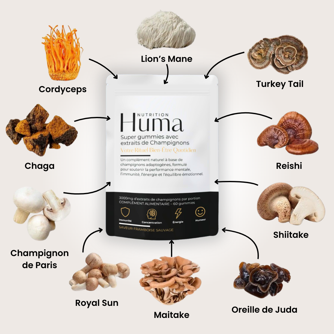 Nos Super Gummies ont été conçus pour vous accompagner au quotidien : ils soutiennent la vitalité, l’équilibre hormonal, la clarté mentale, l’humeur, la digestion et l’immunité grâce à l’action synergique de 12 champignons fonctionnels.