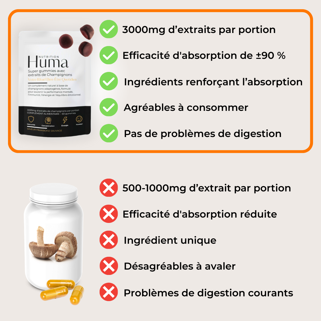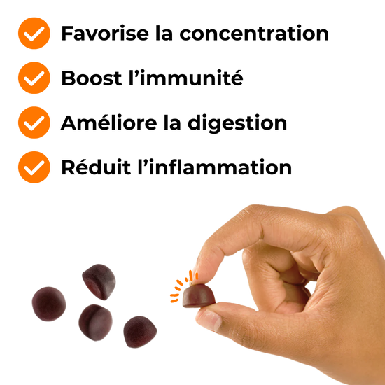 Vous savez certainement que le corps n’absorbe qu’une fraction des compléments en capsules. C'est pourquoi nous avons opté pour les gommes, car elles commencent à libérer les nutriments dès le contact avec la salive, permettant une absorbtion optimale.